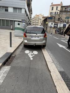 Véhicule garé sans complexe sur piste s-cyclable, rue du Rouet, Marseille