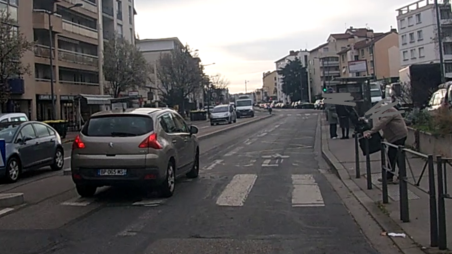 Une papi à son passage piéton devant le marché. Toutes les voies sont arrêtés même les vélos. Lui, il fonce!