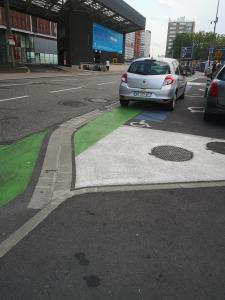 Il est surtout à moitié garé sur une place handicapée, mais ça a pas l'air aussi important que le fait qu'il soit sur une piste cyclable...