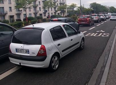 Clio blanche à Lyon. Utilise une voie de bus pour doubler tout le monde par la droite. Le comble, devant lui, un fourgon rempli d'agents. Mais il a bien compris que la police est laxiste par chez nous et sait comment profiter du système.