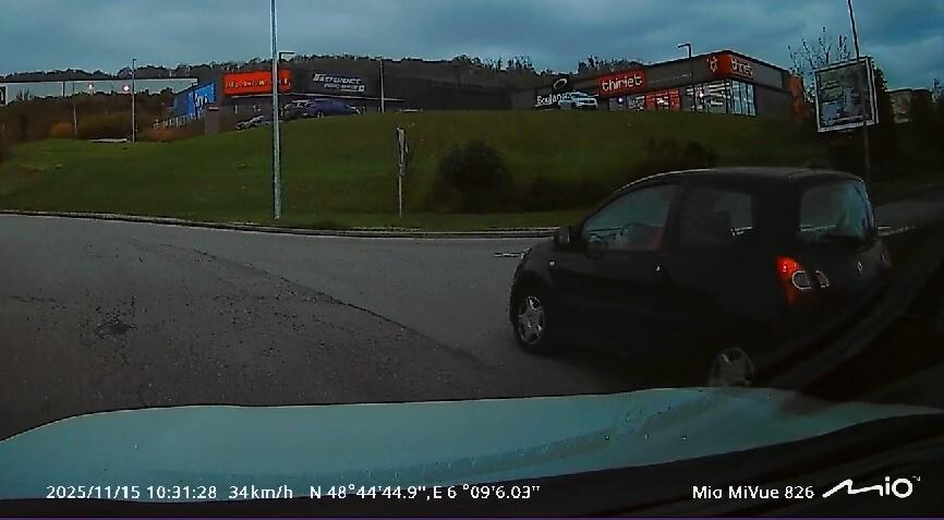Une femme en twingo noire qui fait le tour du rond point, voie de droite sans cligno. Il faudrait apprendre à conduire dans les giratoires, c'est saoulant. (Rond point de Frouard (54)