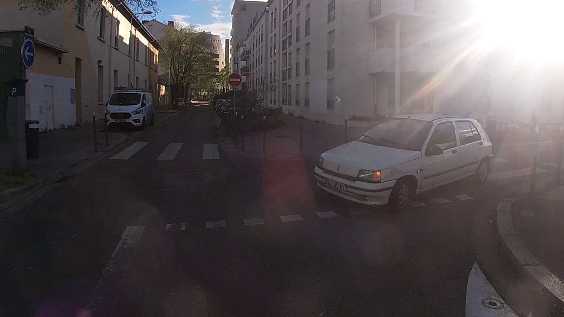 Ancienne Clio 1 blanche à Lyon conduite par une femme. Modèle si ancien que pas la direction assistée, prend les virages tellement large qu'elle a besoin de la voie inverse pour serrer dessus... Pire, face à nous elle a refusé de reculer, c'est nous qui avons dû reculer. Fenêtre baissée, j'ai fait une remarque, elle m'a répondu un truc que je n'ai pas compris mais ça semblait pas commode.