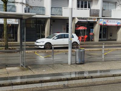 Bagnole qui se gare régulièrement sur le quai d'attente du bus. Ce n'est pas une place de parking : c'est un quai. D'ailleurs pour venir se garer ici, la bagnole doit circuler sur la piste cyclable sur une bonne vingtaine de mètres.