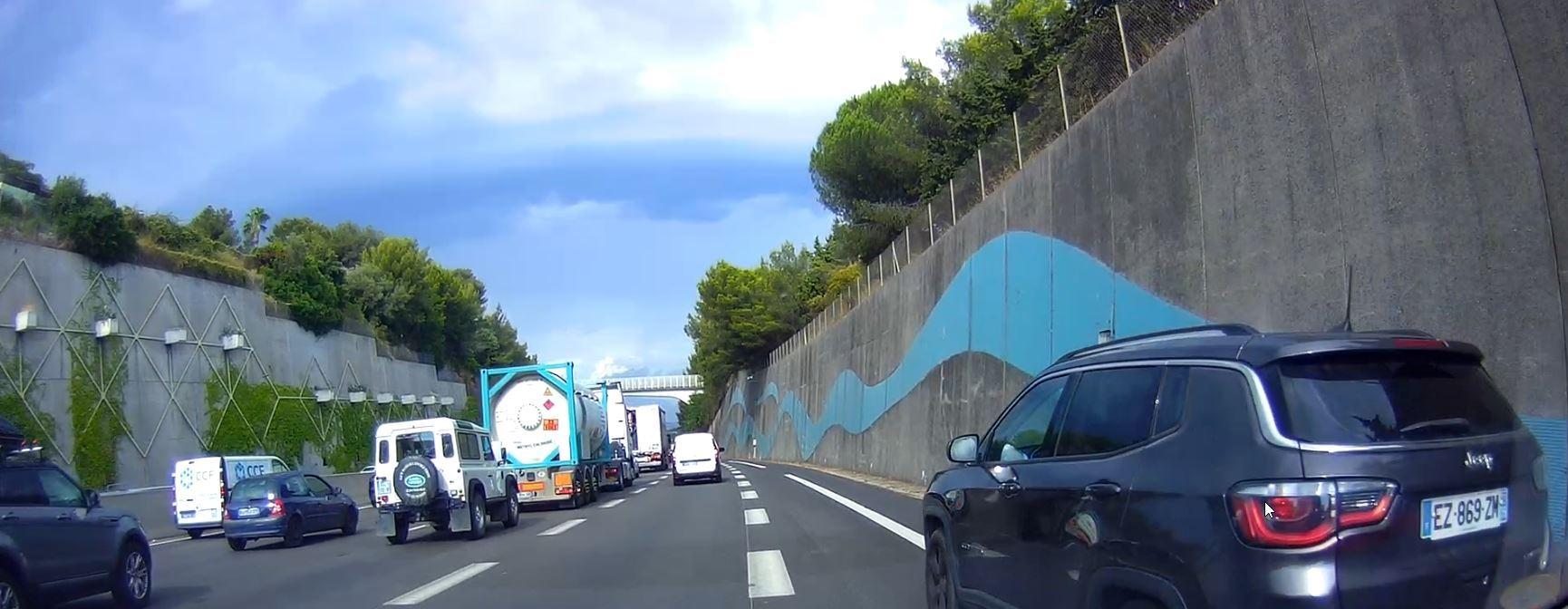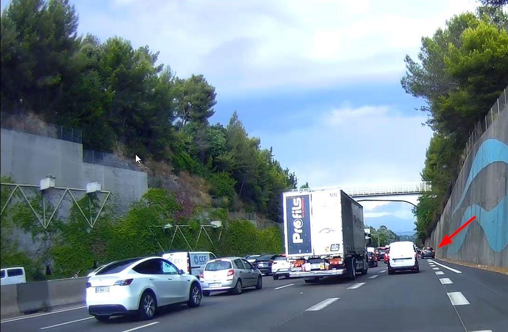 Me klaxonne parce que je ne m'insère pas assez vite dans la voie. Logique c'est embouteillé. Puis me double par la BAU et remonte toute la file sur la BAU.