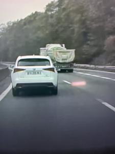 Obligé de le doubler par la droite car stagne à gauche et n’a pas assez de puissance pour doubler les camions et ne réagit pas aux appels de phares