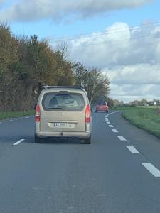 Conducteur de Peugeot 206 qui conduit en téléphonant tout en tenant son téléphone bien en vue sans jamais mettre de clignotants et avec 2 feux de stop HS (et le 3ème fonctionnant à moitié)