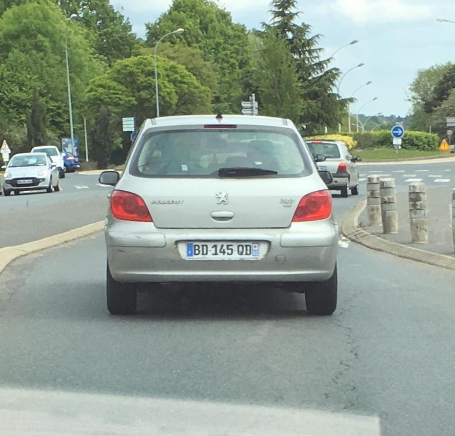Colle au cul, double sur une ligne blanche continue et force le passage au rond-point suivant!