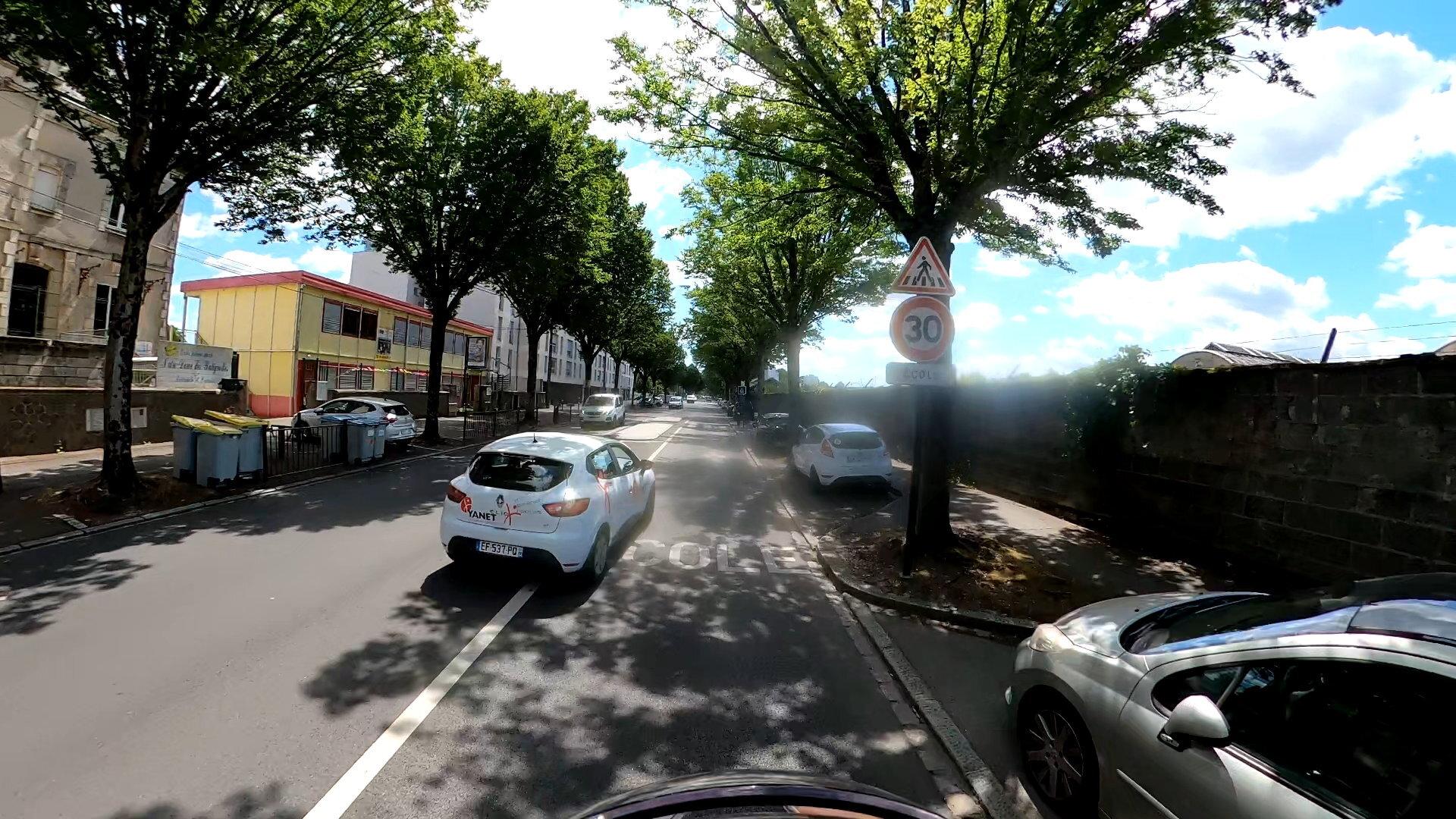 Double sur ligne continue, sur un "ralentir école", limité à 30km/h (je n'étais sûrement pas loin de cette vitesse qui n'est pas une vitesse obligatoire à atteindre...), juste avant un rétrécissement pour passage piéton...