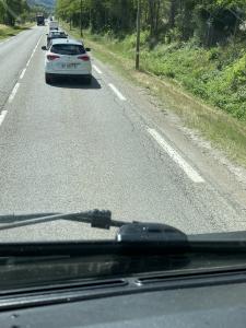 Conductrice sans gêne, incapable de serrer sur la route, bloque la circulation pour taper la discute... Prétend chercher son chemin mais sort un smartphone pour prendre des photos quand son comportement commence à énerver les autres usagers qui souhaitent simplement passer...