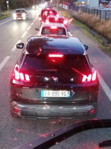 Avant un ronds-points il y a une voiture devant lui. ilse met sur la voie de droite pour doubler par la droite pour faire le tour du rond-point