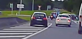 Ce motard double de manière dangereuse (ligne blanche continue) plusieurs voitures, se rabat sans se soucier une seconde des automobilistes, en les obligeant à freiner.
